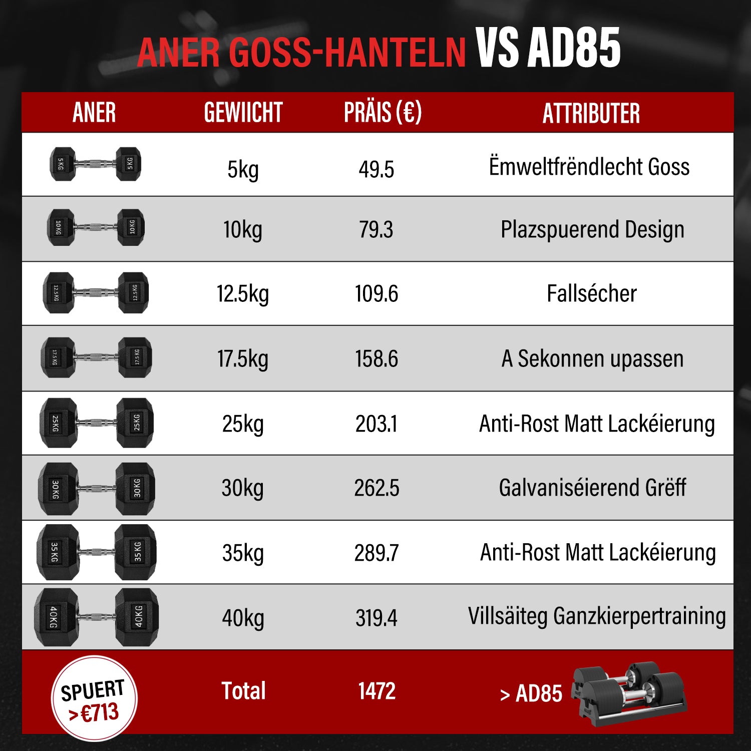 Kombinéiert Text mat engem Bild fir d'Produkt ze markéieren, Sammlung oder de Blog Artikel vun Ärer Wiel. Füügt Disponibilitéit oder Stilinatiounen. Dir kënnt souguer e Bewäertung ofginn. Den Ad85 Dumbbell Set benotzt Platen mat engem méi klenge Duerchmiesser fir d'Gläichgewiicht beim Training ze halen. Den décke 3,56 cm handelen, garantéiert eng besser Gripererfarung. Et ass fir Leit vun allen Gréisst a Gewiicht entworf.