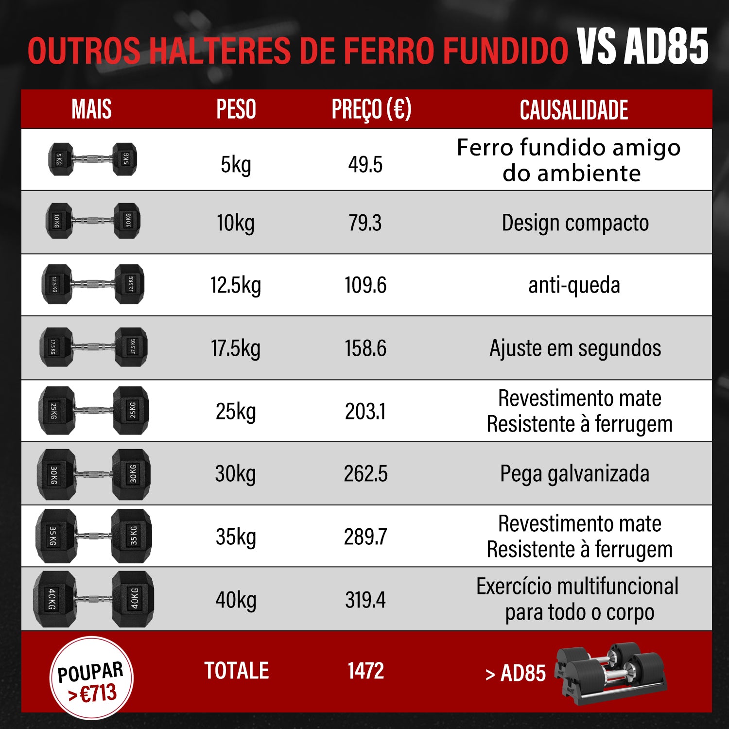 -Substitua 8 pares de halteres. (24 pares se você usar nosso somador de peso magnético!)